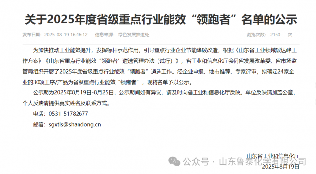 近日,山东省工业和信息化厅发布《关于公布2025年度省级重点行业能效“领跑者”名单的通知》。鲁泰化学以烧碱单位产品能耗297.66kgce/t获得烧碱行业能效“领跑者”称号,这标志着鲁泰化学在绿 ...