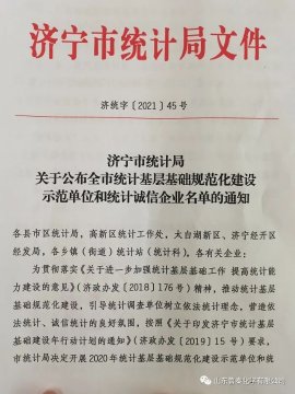 p/p 近日,济宁市统计局发布了《关于公布全市统计基层基础规范化建设示范单位和统计诚信企业名单的通知》(济统字【2021】45号文),鲁泰化学榜上有名,荣获济宁市“统计诚信企业”荣誉称号 ...