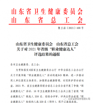 p/p 12月18日,从鱼台县卫健局职业健康科传来喜讯,在山东省卫生健康委联合省总工会组织开展的争做“职业健康达人”活动中,经申报、推荐、初审和审核,化学公司郑冲成功入选,喜获山东省 ...