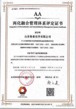 p/p 近日,鲁泰化学顺利通过国家工业和信息化部《信息化和工业化融合管理体系要求》(GB/T 23001-2017) 及《信息化和工业化融合管理体系 新型能力分级要求》 (GB/T 23006-2022) 认证评定。荣获两化融合 ...
