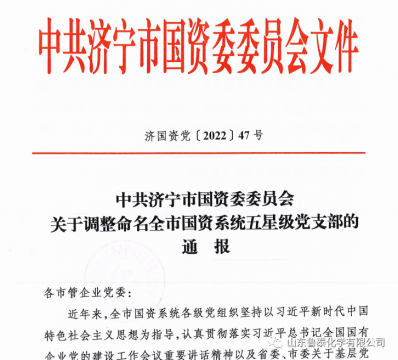 p/p 近日,中共济宁市国资委委员会印发《关于调整命名全市国资系统五星级党支部的通报》,鲁泰化学行政党群党支部、生产党支部、氯碱车间党支部、聚氯乙烯车间党支部、电仪车间党支部、公 ...