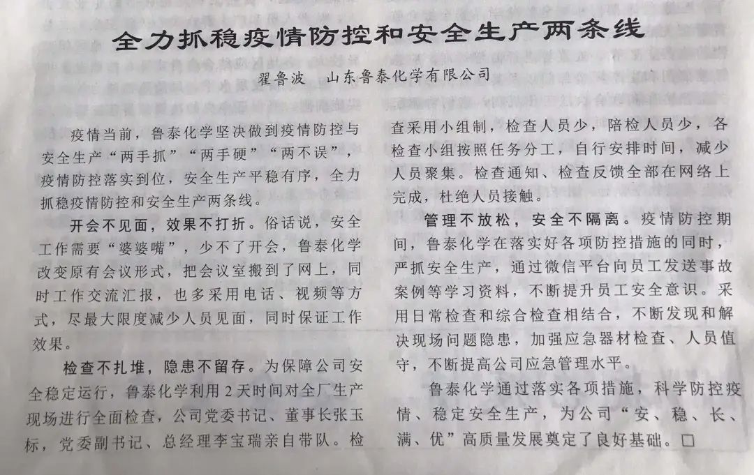 2020年3月11日,国家级新闻媒体《化工安全与环境》第10期,在HSE管理动态专栏刊发了鲁泰化学翟鲁波撰写的《全力抓稳疫情防控和安全生产两条线》专题报道。