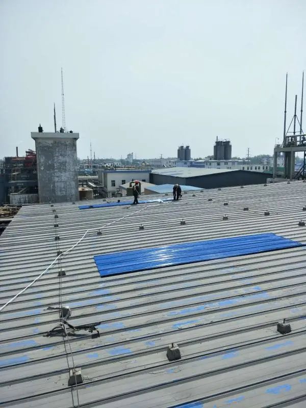 在仓储中心人员的严格认真的现场监管下,施工单位通过对棚顶漏点用新彩钢板交叉覆盖板边打胶密封进行修补,确保了雨水不进入修补点;对顶棚周围腐蚀的墙板全部进行了拆除更换,燕尾钉密集固定,确保了安装的牢固性。