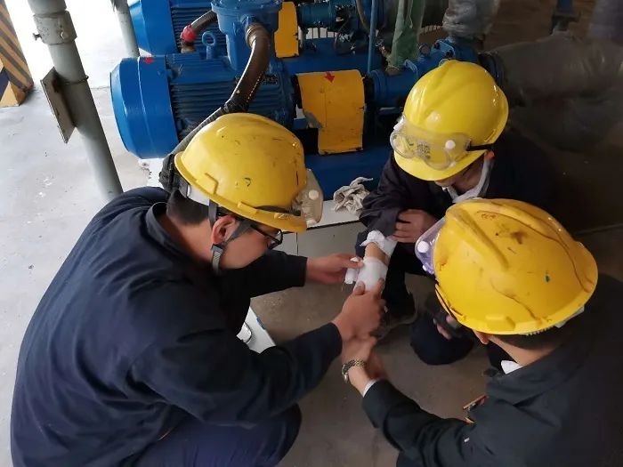 演练模拟操作工在擦拭运转机泵时,擦机布被卷入机泵转动部位,造成操作工手臂擦伤。现场总指挥接到报告后,立即启动应急救援预案。救援人员首先停止运转设备,使受伤人员与运转设备脱离,避免二次伤害。然后对受伤人员进行了初步包扎救治后送医,同时,安排人员恢复正常生产。