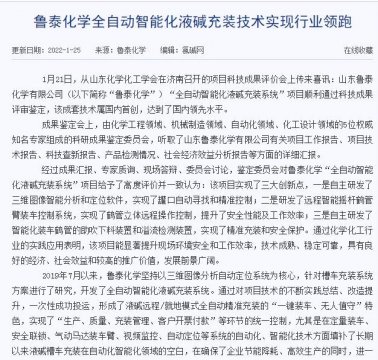 1月25日,中国氯碱网刊发了化学公司孟苗、鲁泰化工康艳撰写的题为《 鲁泰化学全自动智能化液碱充装技术实现行业领跑 》文章。 文章中提到, 1月21日,从山东化学化工学会在济南召开的项 ...