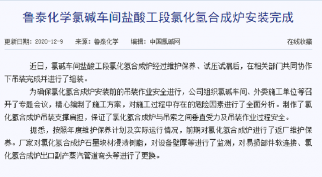 12月9日,中国氯碱行业权威门户网站——中国氯碱网,在新闻专栏刊发了鲁泰化学赵洁撰写的题为《氯碱车间盐酸工段氯化氢合成炉安装顺利完成》的文章。 文章报道了该氯化氢合 ...