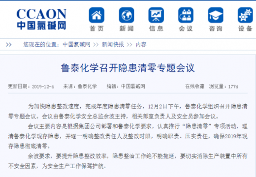 12月4日,我国氯碱行业权威门户网站——中国氯碱网,在新闻专栏刊发了鲁泰化学时政撰写的题为《鲁泰化学召开隐患清零专题会议》的文章,对鲁泰化学组织推进隐患清零工作进行了 ...