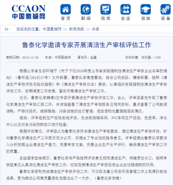11月28日,我国氯碱行业权威门户网站——中国氯碱网,在新闻专栏刊发了鲁泰化学金鑫撰写的题为《鲁泰化学邀请专家开展清洁生产审核评估工作》的文章,对鲁泰化学开展清洁生产审 ...