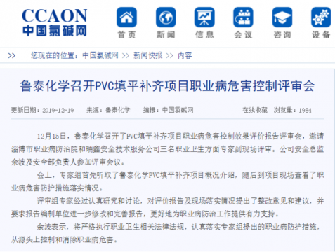 12月19日,我国氯碱行业权威门户网站——中国氯碱网,在新闻专栏刊发了鲁泰化学翟鲁波撰写的题为《鲁泰化学召开PVC填平补齐项目职业病危害控制评审会》的文章,对鲁泰化学PVC填平 ...