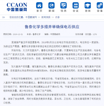 12月31日,我国氯碱行业权威门户网站——中国氯碱网,在新闻专栏刊发了鲁泰化学张宁撰写的题为《鲁泰化学多措并举确保电石供应》的文章,对鲁泰化学多措并举确保电石供应工作进 ...