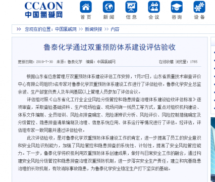 7月30日,我国氯碱行业权威门户网站——中国氯碱网,在新闻专栏刊发了鲁泰化学杜海波撰写的题为《鲁泰化学通过双重预防体系建设评估验收》的文章,对鲁泰化学顺利通过双重预防 ...