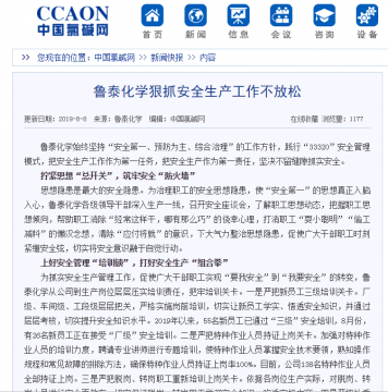 8月8日,我国氯碱行业权威门户网站——中国氯碱网,在新闻专栏刊发了鲁泰化学李香玲撰写的题为《鲁泰化学狠抓安全生产工作不放松》的文章,对鲁泰化学坚持安全生产工作进行了 ...