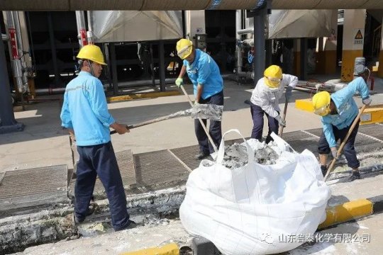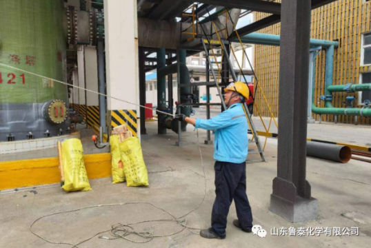氯碱车间 6月2日,氯氢处理工段丙班人员在班长王建建的带领下,不停地往二楼输送氯气洗涤塔填料,一人拉,三人拽,相互接力,团结协作,一袋袋填料安全运送到位,汗水湿透了他们的衣襟, ...