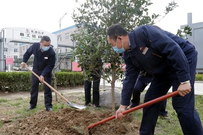 在志愿者们的辛勤劳动下,一株株树苗在厂区主干道旁迎风而立,展现出生机勃勃的盎然春意,也彰显了鲁泰化学红色引领、绿色发展、争创一流的理念和精神。