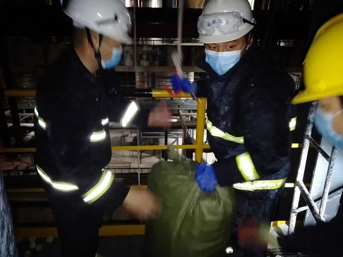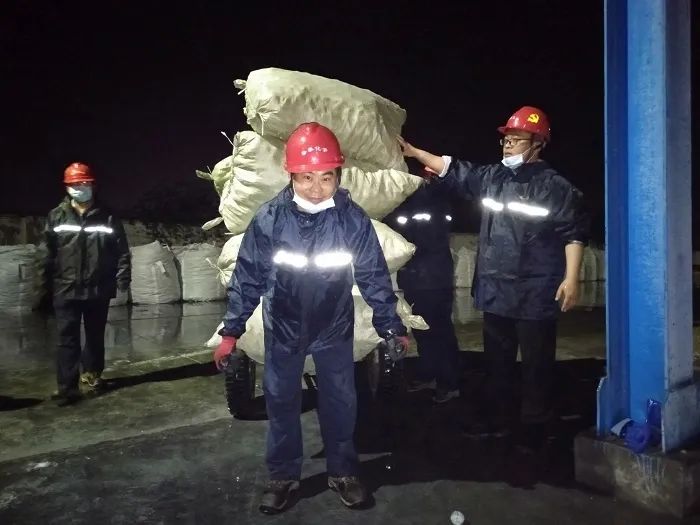 当日下午3:00,在公司领导的带领下,广大干部职工打开清净塔人孔进行填料拆除工作,直至次日凌晨6点将两台清净塔内120m³填料全部清出。9日下午7:00,填料进厂,在经营部室的配合下,广大干部职工搬运填料的身影迎着细雨在工作现场来回穿梭。10日凌晨,在领导班子成员的现场指挥下,各车间、部室人员积极拉绳索,运填料,默契配合,最终将填料运至塔顶。