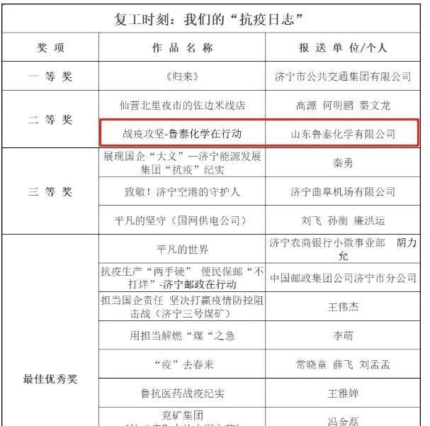 历时3个月,由市总工会、共青团济宁市委、济宁市卫生健康委、济宁市国资委、济宁广播电视台、济宁市农商行共同主办的同“济”同心 战“疫”有你——济宁市抗击疫情系列创意微视频大赛活动中,《战役攻坚 鲁泰化学在行动》在500余件作品中脱颖而出,并在“复工时刻”专题中荣获二等奖。