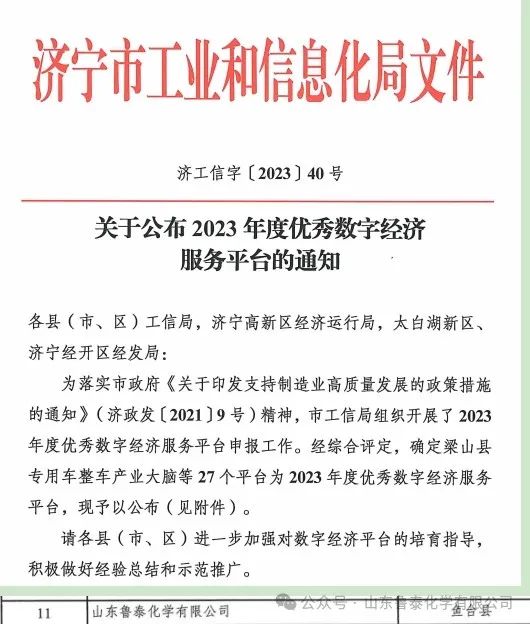 近期,济宁市工业和信息化局组织开展了济宁市2023年度优秀数字经济服务平台评选活动。由生产部(科技研发中心)提报相关材料,并经市工业和信息化局综合评定,鲁泰化学被评为2023年度优秀数字经济服务平台,同时获10万元奖金。