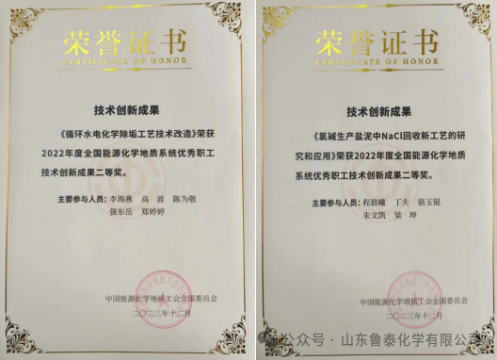 鲁泰化学报送的《循环水电化学除垢工艺技术改造》《氯碱生产盐泥中NaCl回收新工艺的研究和应用》两项创新成果,近日荣获全国能源化学地质系统优秀职工技术创新成果二等奖。 此次获奖,是 ...