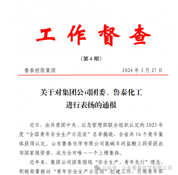 近日,氯碱车间盐酸工段荣获由共青团中央、应急管理部联合组织认定的2023年度“全国青年安全生产示范岗”荣誉称号,成为全市唯一获此殊荣的集体。3月27日,集团公司印发《工作督查》对鲁泰 ...