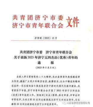 近日,共青团济宁市委、济宁市青年联合会对“2023年济宁五四杰出(优秀)青年”进行了通报表扬。鲁泰化学崔金山经过组织推荐、严格筛选和综合审查、评委会评审等程序,被推选为“济宁五四 ...
