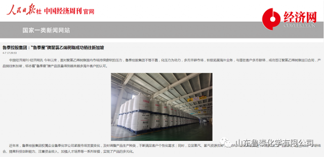 p/p 近日,国家一类新闻网站——由人民日报社《中国经济周刊》创办的经济网对鲁泰化学发展成果进行报道,刊发了题为《鲁泰控股集团:“鲁泰星”牌聚氯乙烯树脂成功销往新加坡》的文章,公 ...