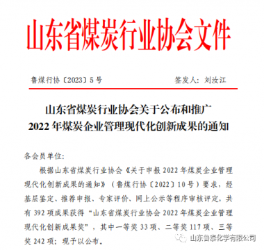 p/p 近日,山东省煤炭行业协会发布了2022 年企业管理现代化创新成果的通知。经基层鉴定、推荐申报、专家评价、网上公示等程序审核评定,鲁泰化学“以创优质现代化工企业为目标的体系构建与 ...