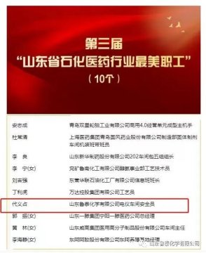 p/p 近日,山东省石油化学工会开展了第三届“山东省石化医药行业最美职工”选树宣传活动,经过广泛发动、层层遴选、审核把关等程序,鲁泰化学电仪车间安全员代义占脱颖而出荣获第三届“山 ...
