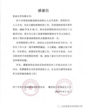 p/p 9月15日,济宁市鱼台县滨湖街道工作人员将一封情真意切的感谢信送到鲁泰化学,对公司职工徐明超在疫情防控最关键的时期,给予滨湖街道孝贤社区的 支持和帮助表示感谢。 滨湖街道相关负 ...