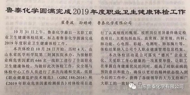 近日,国家级新闻媒体《化工安全与环境》第45期,在HSE管理动态版面刊发了鲁泰化学翟鲁波、孙婷婷撰写的《鲁泰化学圆满完成2019年度职业卫生健康体检工作》专题报道。 此篇文章报 ...