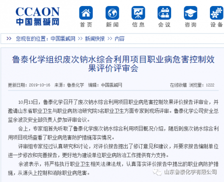 10月16日,我国氯碱行业权威门户网站——中国氯碱网,在新闻专栏刊发了鲁泰化学杜海波撰写的题为《鲁泰化学组织召开废次钠水综合利用项目职业病危害控制效果评价评审会》的文章 ...