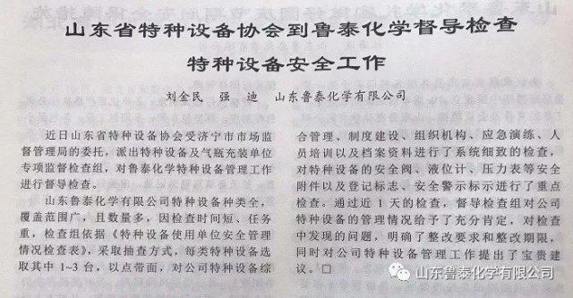 2019年10月9日,国家级新闻媒体《化工安全与环境》在HSE管理动态专栏刊发了鲁泰化学刘金民、强迪撰写的题为《山东省特种设备协会到鲁泰化学督导检查特种设备安全工作》的专题报道 ...