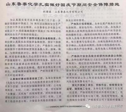 近日,国家级媒体《化工安全与环境》刊发了鲁泰化学杜海波撰写的《山东鲁泰化学扎实做好国庆节期间安全保障措施》专题报道。 此篇文章深刻阐述了鲁泰化学采取的严格执行领导干 ...