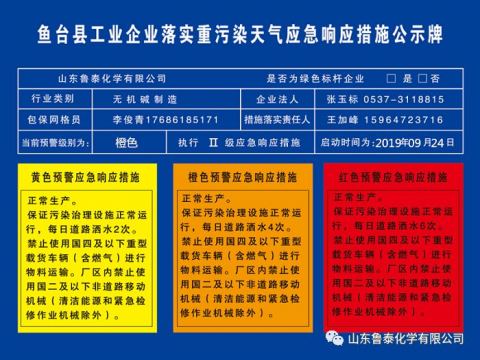 9月23日,各级环保部门发布重污染天气橙色预警,要求24日0时启动Ⅱ级应急响应。鲁泰化学领导高度重视,结合公司实际,统一安排部署,及时启动应急响应,严格落实各项应急减排工 ...