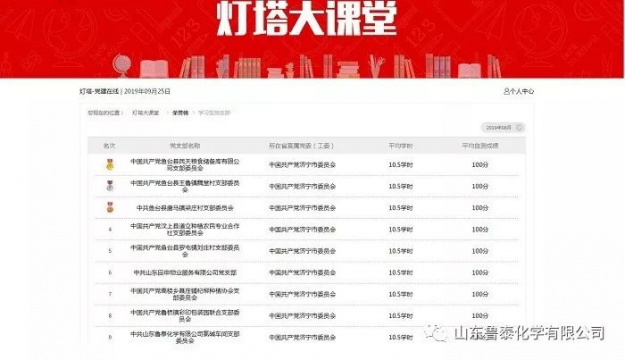 近日,“灯塔-党建在线”灯塔大课堂第二课学习竞赛活动成绩公布,鲁泰化学氯碱车间党支部在活动中表现突出,在全省学习型党支部中排行第9名;氯碱车间党支部侯勇同志以优异的成 ...