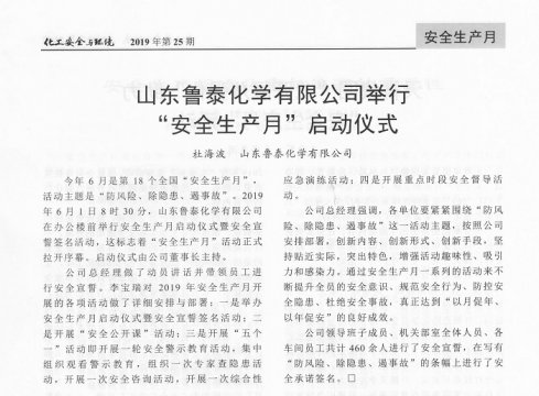 2019年6月26日,国家级新闻媒体《化工安全与环境》在安全生产月专栏刊发了鲁泰化学杜海波撰写的题为《山东鲁泰化学有限公司举行“安全生产月”启动仪式》的文章,对鲁泰化学20 ...