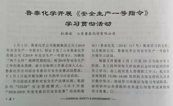 2019 年1月30日,国家级新闻媒体《化工安全与环境》第5期,在HSE管理动态版面刊发了鲁泰化学杜海波撰写的《鲁泰化学开展安全生产一号指令学习贯彻活动》专题报道。 此篇文章宣传了 ...