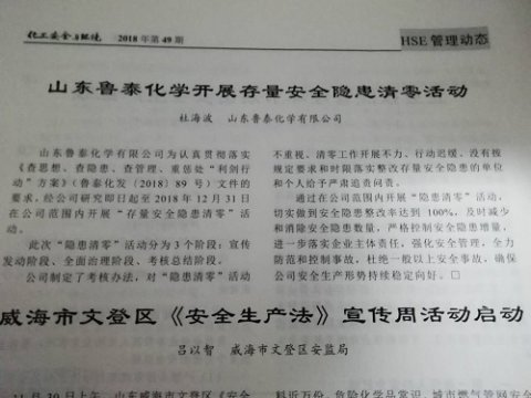 12 月19日,国家级新闻媒体《化工安全与环境》第49期,在HSE管理动态版面刊发了鲁泰化学杜海波撰写的《鲁泰化学开展存量安全隐患清零活动》专题报道。 此篇文章报道了公司开展“ ...