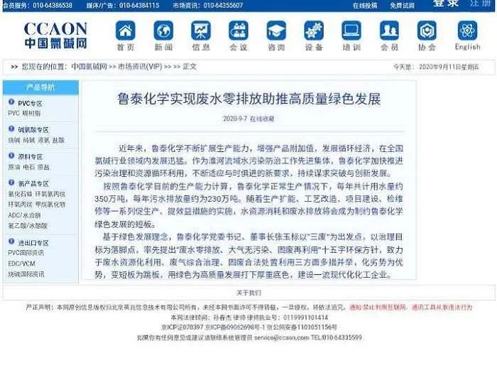 近日,国家级新闻媒体《中国氯碱网》在市场资讯专栏刊发了鲁泰化学金鑫撰写的《鲁泰化学实现废水零排放助推高质量绿色发展》的文章,对鲁泰化学按照预防为主、防治结合、综合治理的原则,实现废水零排放进行了报道。